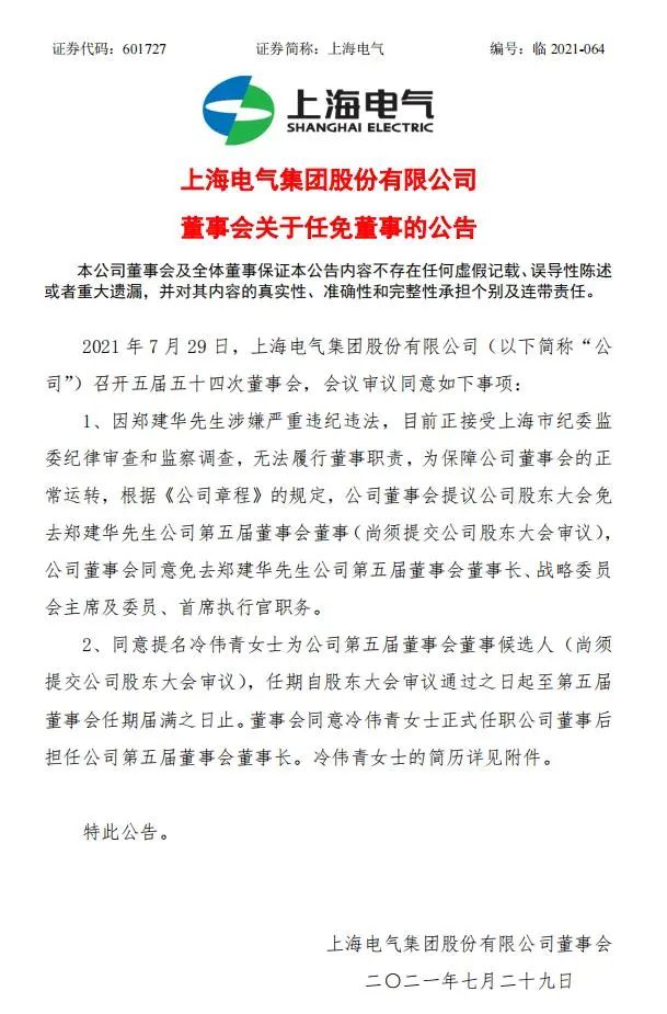 7月29日,上海电气(证券代码:601727)发布公告称,公司于2021年7月29日召开了公司董事会五届五十四次会议。因郑建华涉嫌严重违纪违法,目前正接受上海市纪委监委纪律审查和监察调查,无法履行董事职责。为保障公司董事会的正常运转,现根据《公司章程》的规定,同意提议公司股东大会免去郑建华上海电气集团股份有限公司第五届董事会董事职务。本议案尚须提交股东大会审议。