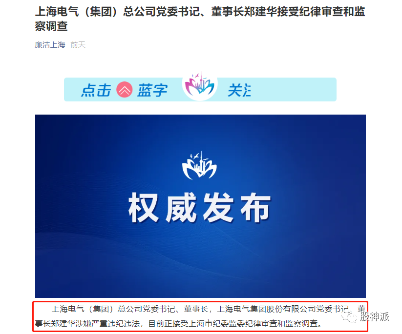 7月27日,“廉洁上海”微信公众号发布消息,上海电气(集团)总公司党委书记、董事长,上海电气集团股份有限公司党委书记、董事长郑建华涉嫌严重违纪违法,目前正接受上海市纪委监委纪律审查和监察调查。