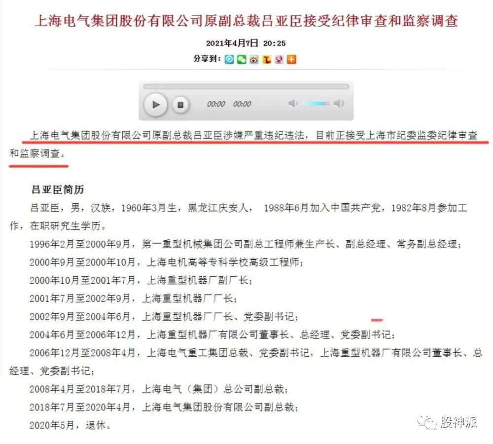 2020年4月,上海电气原副总裁吕亚臣涉嫌严重违纪违法,正接受上海市纪委监委纪律审查和监察调查。2018年7月至2020年4月,吕亚臣担任上海电气副总裁,2020年5月退休。