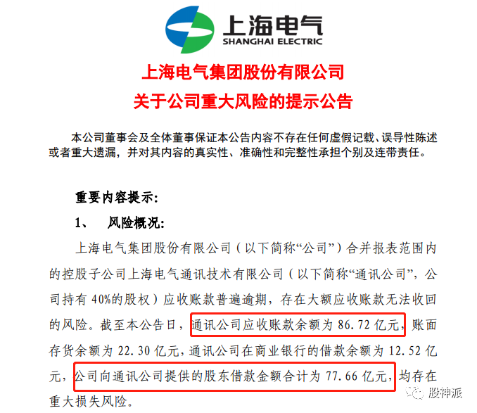 截至公告日,电气通讯应收账款余额为86.72亿元,账面存货余额为22.30亿元,电气通讯在商业银行的借款余额为12.52亿元,公司向电气通讯提供的股东借款金额合计为77.66亿元,均存在重大损失风险。