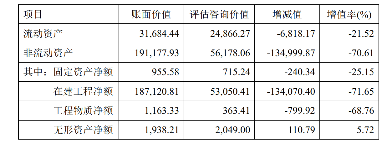 在重庆神华的资产中,余额最大的为在建工程,总计约18.7亿元。目前,重庆神华方面的资产评估机构给出的评估意见为“在建工程减值约13.4亿元”。