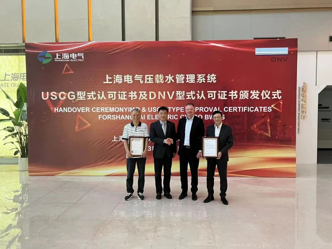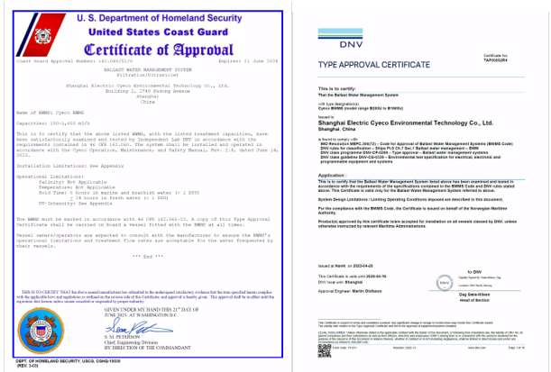 6月29日,DNV为上海电气自主研发的Cyeco压载水管理系统(Cyeco BWMS)颁发了IMO和USCG (美国海岸警卫队)的型式认可证书。这也是全球首个采用UV技术的压载水处理系统获得免停留(T0 Zero Hour Holding Time)的USCG型式认可证书。