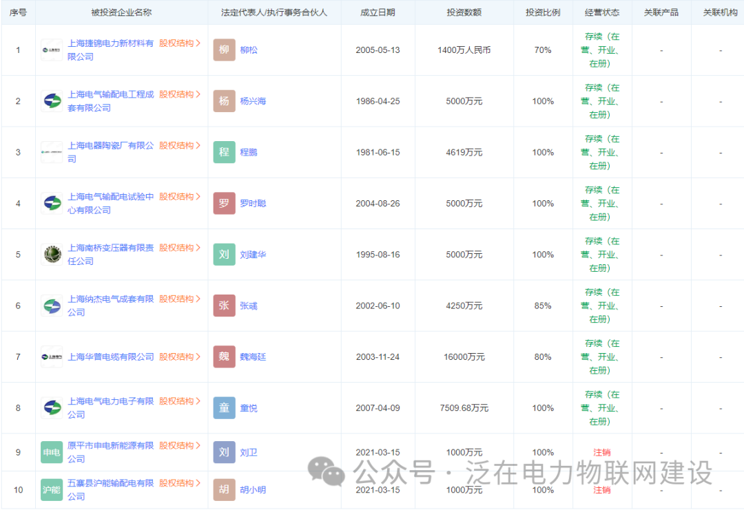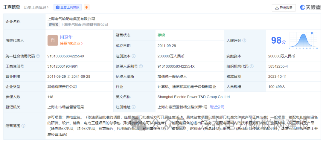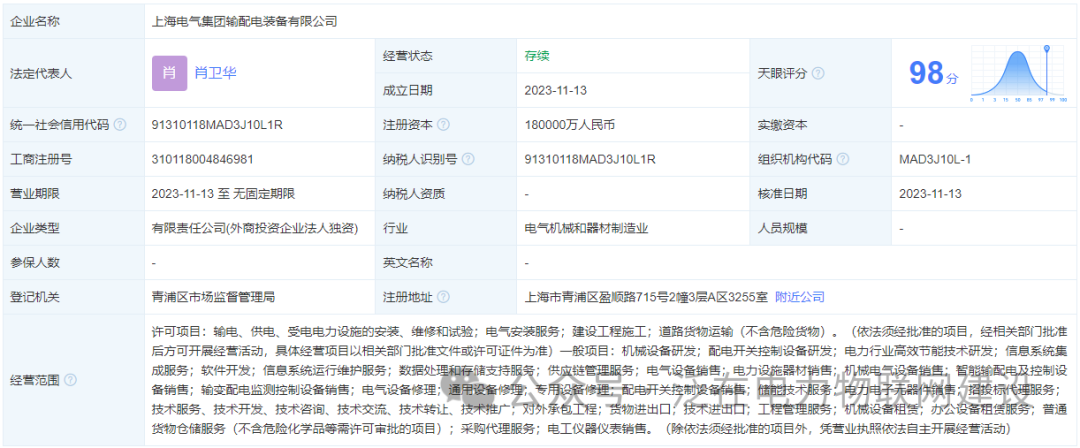 此前,2023年11月份,上海电气集团输配电装备有限公司成立,法定代表人为肖卫华,注册资本18亿元,经营范围包含:供应链管理服务;电气设备销售;储能技术服务;电力电子元器件销售等。股东信息显示,该公司由上海电气100%控股。