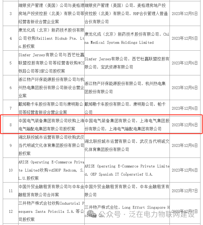 国家市场监督管理总局反垄断执法二司日前发布了“ 2023年12月4日-12月10日无条件批准经营者集中案件列表”,其中涉及到了“中国电气装备集团有限公司收购上海电气输配电集团有限公司股权案”,相关企业包括了中国电气装备集团有限公司,上海电气集团股份有限公司,上海电气输配电集团有限公司。该股权案已于2023年12月6日审结完成。