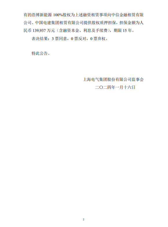 同意浩博新能源以融资租赁方式为临夏光伏项目融资人民币95,000万元,综合利率4.8%,期限15年。其中,晟达新能源将所持有的浩博新能源100%股权为上述融资租赁事项向中信金融租赁有限公司、中国电建集团租赁有限公司提供股权质押担保,担保金额为人民币139,937万元(含融资本金、利息及手续费),期限15年。
