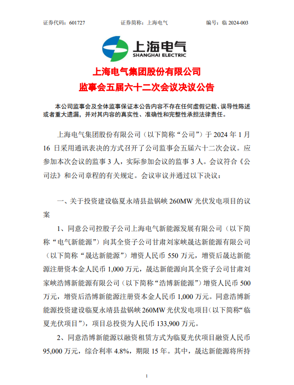 1月17日,上海电气发布公告称,公司五届八十八次董事会审议通过《关于投资建设临夏永靖县盐锅峡260MW光伏发电项目的议案》。