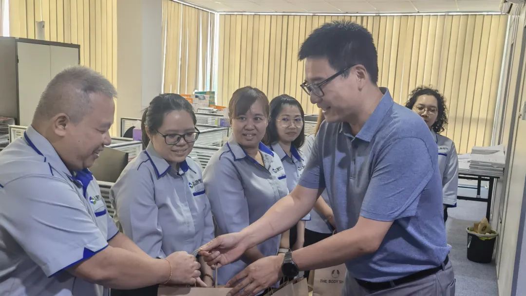 马来西亚是热带国家,常年高温酷暑,骄阳似火,炎热的气候给项目建设者带来了严峻的“烤”验。“海外工程项目背后都凝结着你们的无私奉献和默默付出”,在上海电气输配电工程成套(马来西亚)有限公司,吴磊与项目建设者代表亲切握手,细心询问大家的工作和生活情况,勉励大家继续保持冲和闯的拼搏精神,不断夯实能力,为集团海外事业作出新的更大贡献。