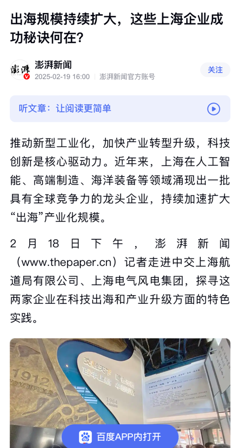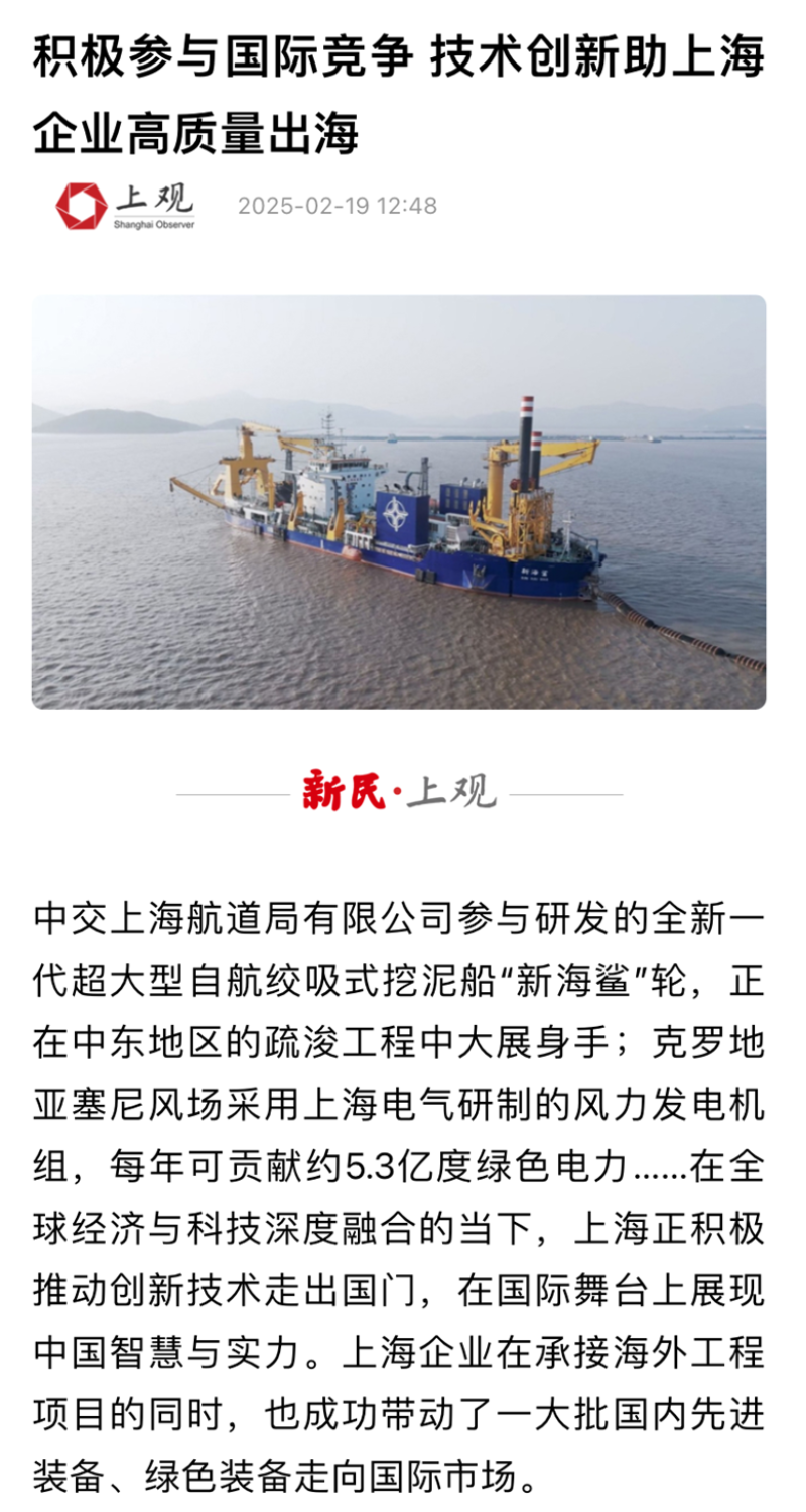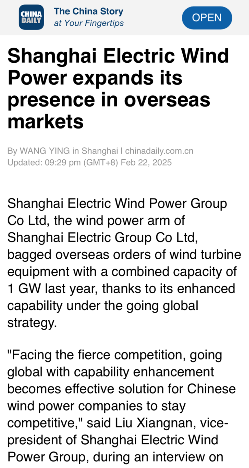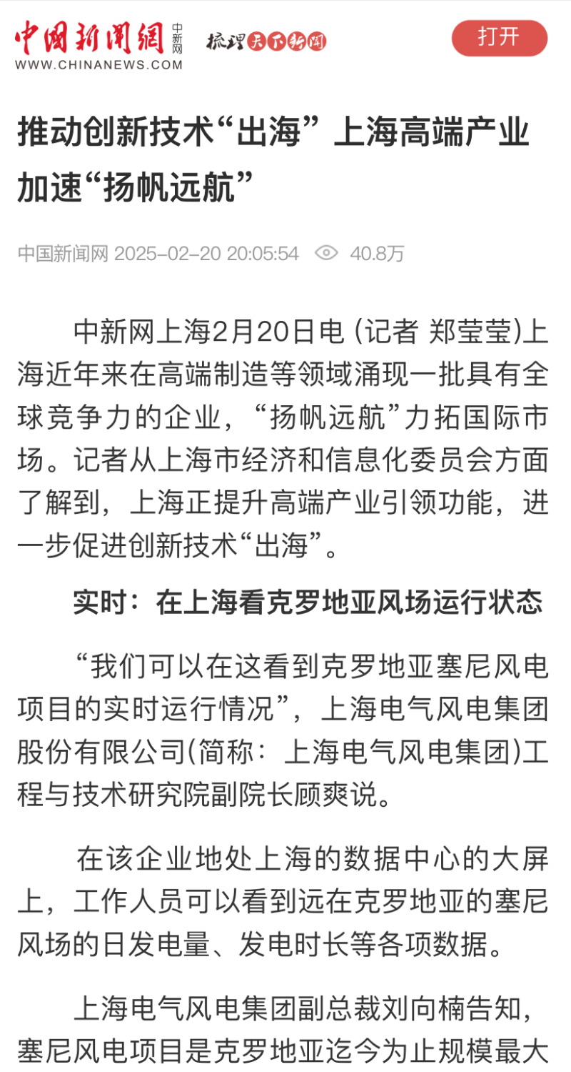近日,上海市经济和信息化委员会调研上海电气风电集团股份有限公司(以下简称“电气风电”),深入了解上海电气风电产业海外市场拓展近况。这场聚焦新能源“出海”的深度对话受到了包括人民网、中央广播电视总台、央广网、中国新闻网、中国日报、中国青年报、解放日报、文汇报、东方卫视在内的30余家主流媒体的关注,并对此进行了专题报道。