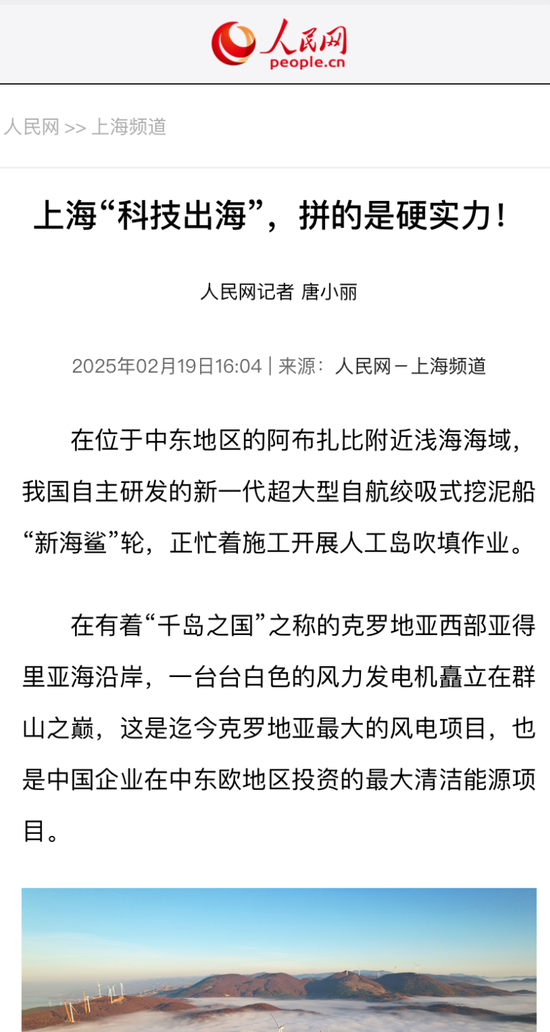 上海电气积极践行“一带一路”倡议,以高端装备制造为基础,积极拓展风电装备在不同国别和场景的应用。据公开数据显示,电气风电2024年海外项目中标量超1GW,涉及欧亚、东南亚、韩国等区域和国家。其中,在克罗地亚的156MW风电项目是当前巴尔干地区运行最大的陆上风电项目,也是欧盟与中国绿色能源合作的样板工程。