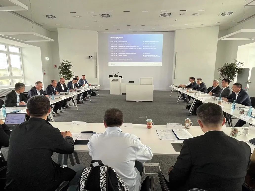 当地时间7月24日上午,上海电气集团党委书记、董事长吴磊率队访问德国凯士比(KSB)总部,与凯士比董事、总经理及首席执行官施特凡·蒂默曼(Stephan Timmermann),中国核电工程有限公司(以下简称“中核工程”)党委书记、董事长徐鹏飞举行会谈,三方围绕核能产业链安全、新兴技术合作、本土化创新及全球市场拓展等展开深入交流。
