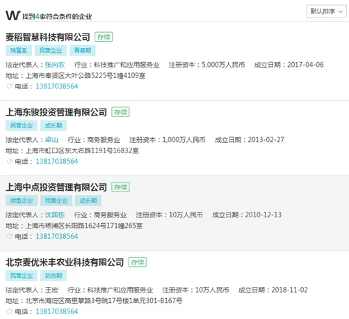 第五大股东上海东骏投资管理有限公司,由自然人梁山100%持有。该公司持有电气通讯8.5%股权。有意思的是,交叉对比企业数据库的相关信息,可以发现,东骏投资注册时使用的手机号码,同时用于注册4家不同公司,其中两家为投资公司,两家为商业服务类,而它们表面上看起来从股东到法定代表人并无关联。这种情况,通常出现在批量注册皮包公司,以达到特殊目的之时(图1)。