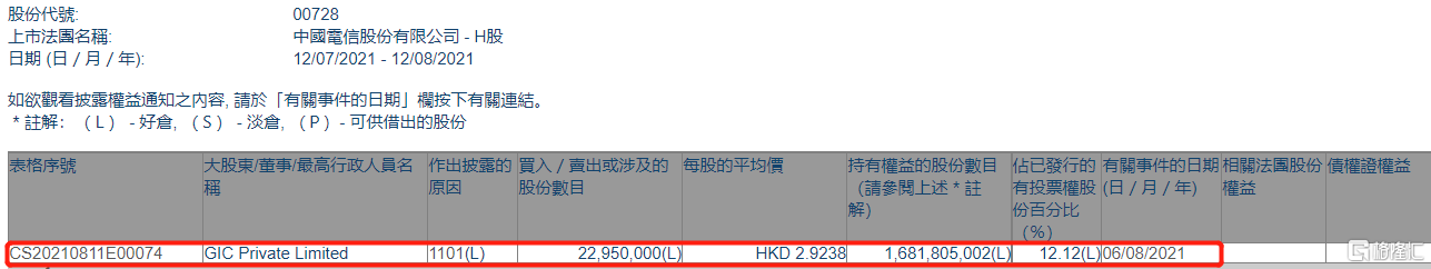 格隆汇APP获悉,根据联交所最新权益披露资料显示,2021年8月6日,中国电信(00728.HK)获GIC Private Limited在场内以每股均价2.9238港元增持2295万股,涉资约6710.12万港元。