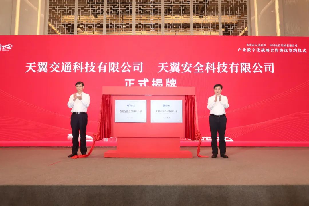 9月2日,在中国电信与苏州市人民政府产业数字化战略合作协议签约现场,天翼安全科技有限公司与天翼交通科技有限公司正式揭牌。