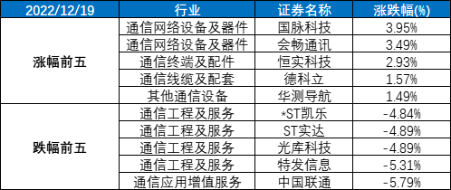 12月19日,通信设备行业下跌1.78%,通信服务下跌3.26%,通信行业中涨幅前五的公司有国脉科技(3.95%)、会畅通讯(3.49%)、恒实科技(2.93%)、德科立(1.57%)和华测导航(1.49%);跌幅前五的公司分别是*ST凯乐(-4.84%)、ST实达(-4.89%)、光库科技(-4.89%)、特发信息(-5.31%)和中国联通(-5.79%)。