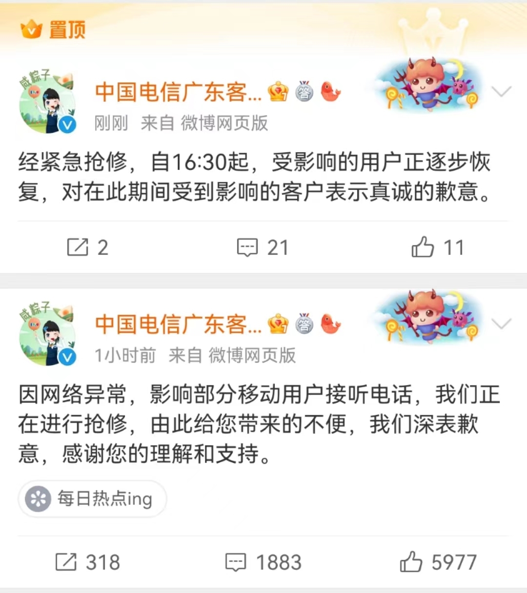 “中国电信广东客服”官方微博最新发文表示,经紧急抢修,自16:30起,受影响用户的接听电话功能逐步恢复。对在此期间受到影响的客户表示真诚的歉意。