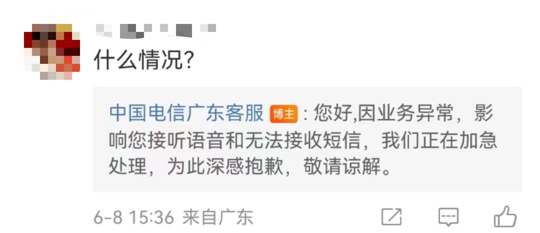 6月8日下午,不少广东电信用户反馈:手机没有信号,移动电话互拨打不通,提示空号等。