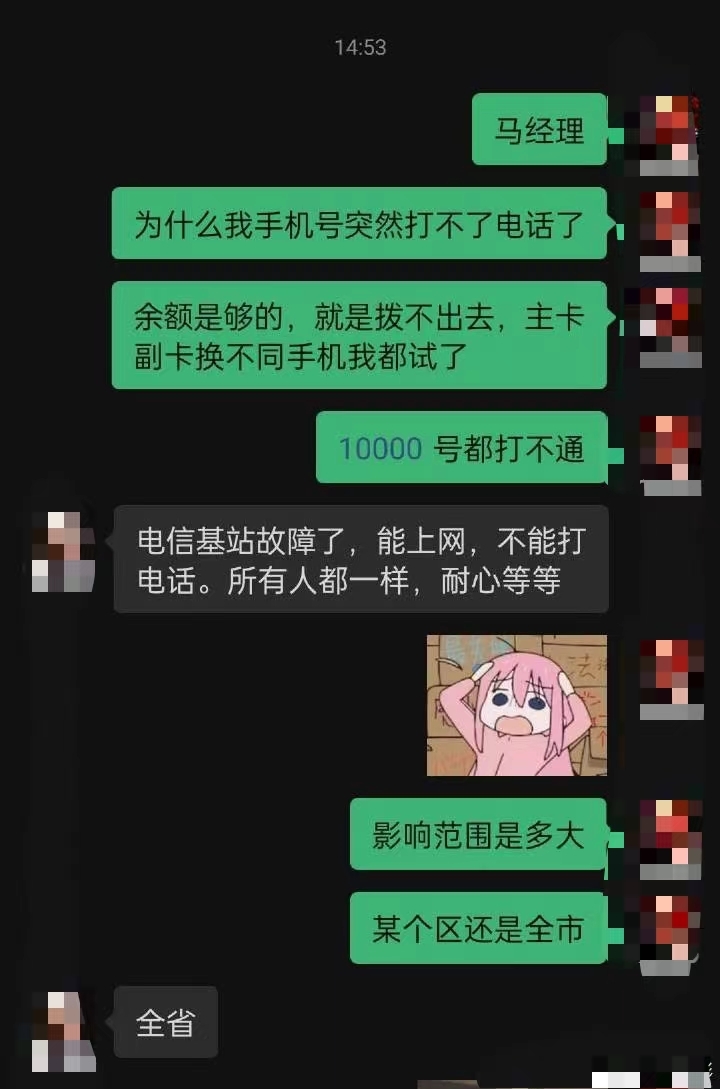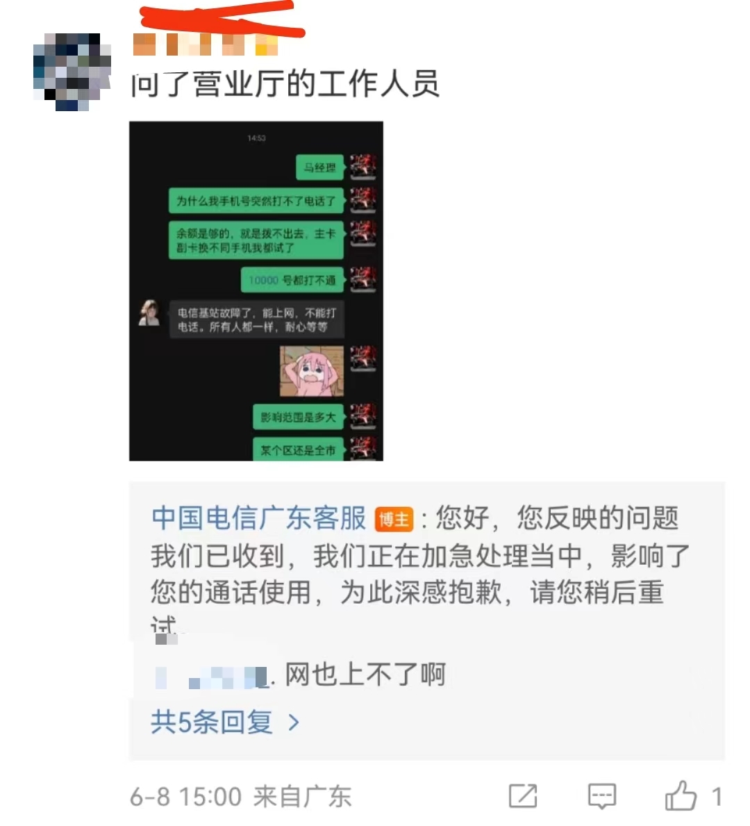 对于相关原因,则有网友在评论区晒出了自己与营业厅工作人员的对话,对方称由于电信基站故障了,能上网,不能打电话,所有人都一样,并且表示此次影响范围是广东全省。