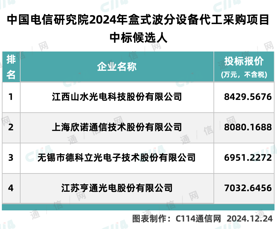 来自中国电信阳光采购网消息,中国电信研究院2024年盒式波分设备代工采购项目已完成评审,评审结果如下: