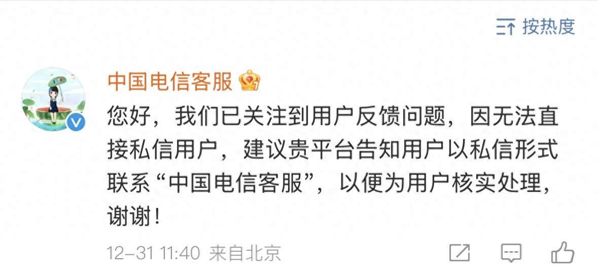 12月31日,针对“电信‘0元购机’老人背上3年分期还款”一事,中国电信客服回应贝壳财经记者称,已关注到用户反馈问题,因无法直接私信用户,建议用户以私信形式联系“中国电信客服”,以便为用户核实处理。截至记者发稿时,中国电信就此事暂无官方回复。