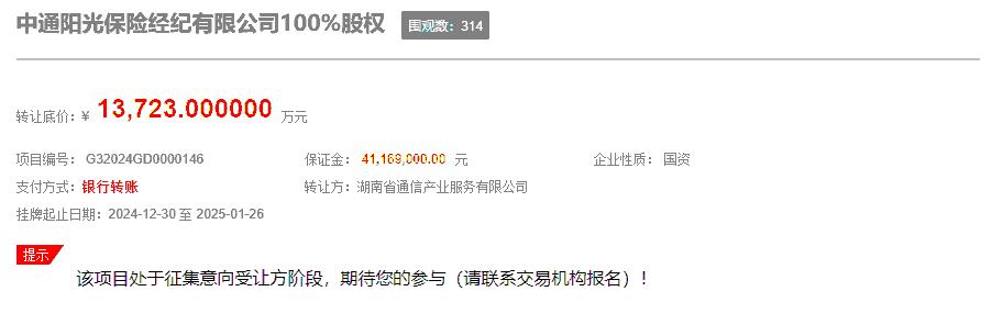 披露的项目信息显示,此次转让的出让方为湖南省通信产业服务有限公司,转让底价为1.37亿元,挂牌截止日期为2025年1月26日,目前该项目处于征集意向受让方阶段。