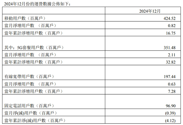12月20日消息,中国电信昨日公布2024年12月份运营数据。当月,中国电信移动用户数净增82万户,移动用户数累计4.2452亿户;当月5G套餐用户净增211万户,5G套餐用户累计3.5148亿户。