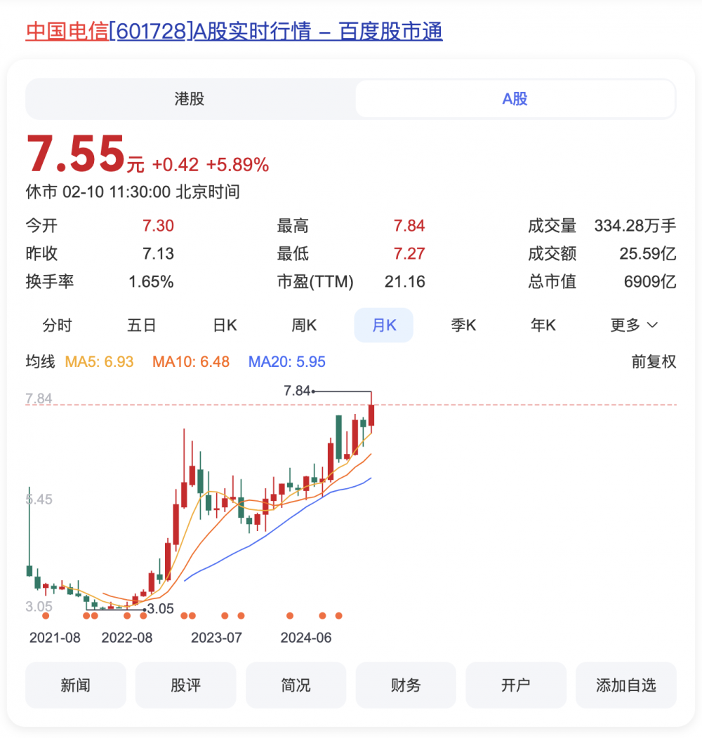 今日,中国电信股价一度触及涨停,创回A上市以来历史新高。截至午间收盘,中国电信涨5.89%,市值来到6909亿元。
