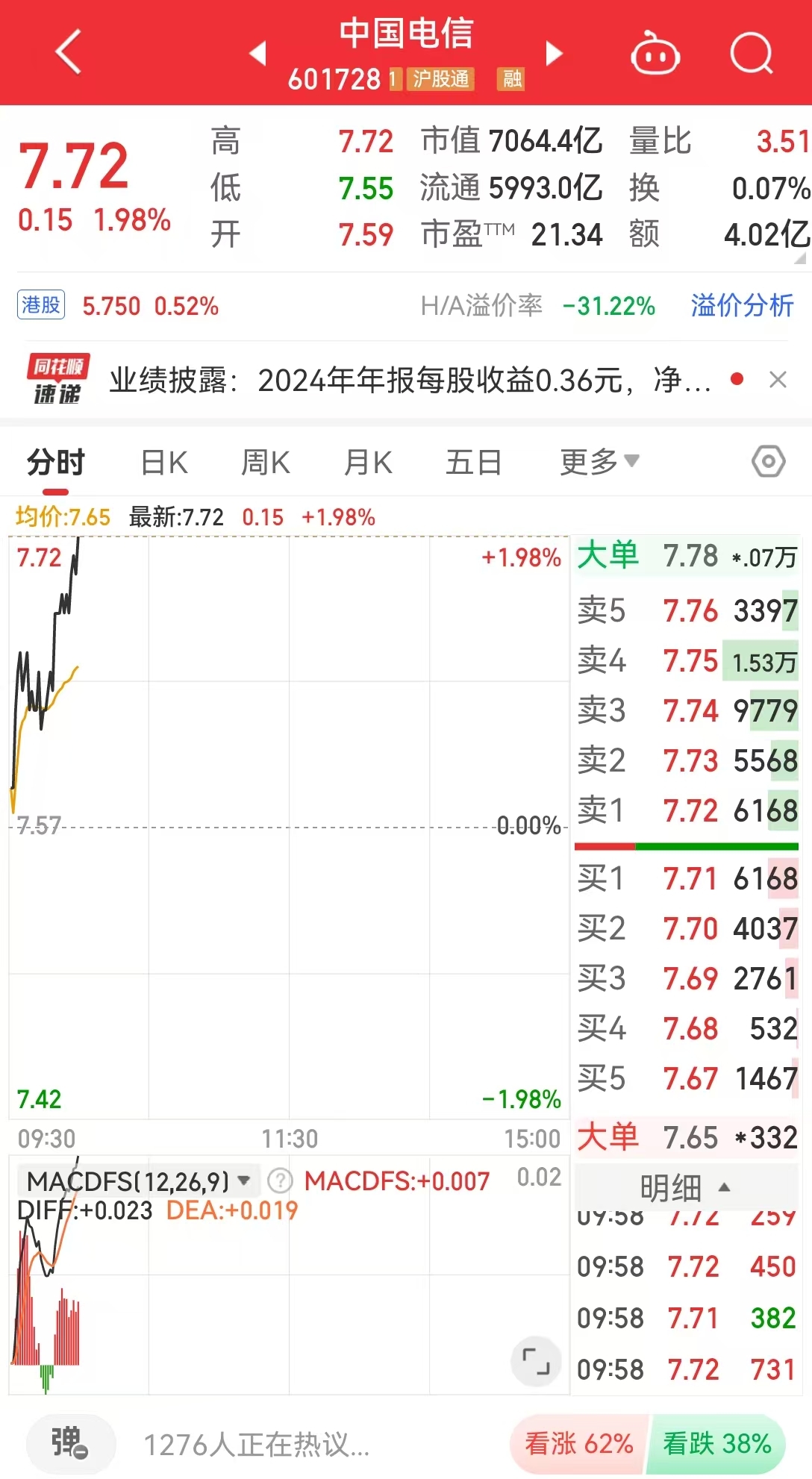 截至3月26日发稿,中国电信(SH601728)报7.72元,涨幅1.98%,市值7064.4亿元。