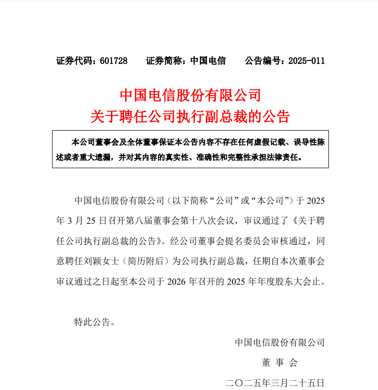 3月25日,中国电信股份有限公司发布关于聘任公司执行副总裁的公告。公告显示,刘颖获委任为中国电信执行副总裁,任期自2025年3月25日起至2026年召开的2025年年度股东大会为止。