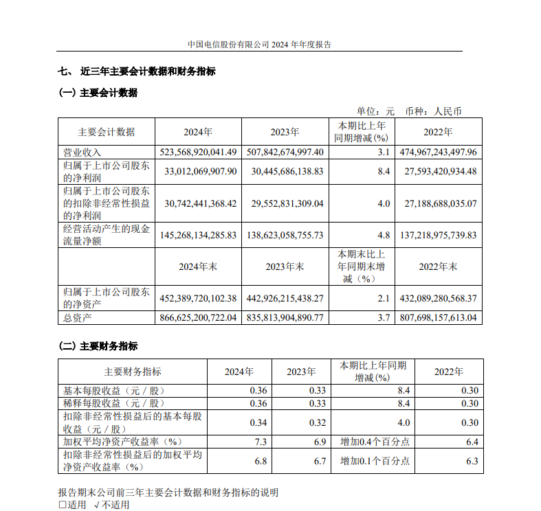 同日晚间,中国电信还披露2024年年报,去年,公司实现营业收入5236亿元,同比增长3.1%,其中服务收入4820亿元,同比增长3.7%。实现净利润330亿元,同比增长8.4%,基本每股收益为0.36元。资本开支为935亿元,同比下降5.4%。
