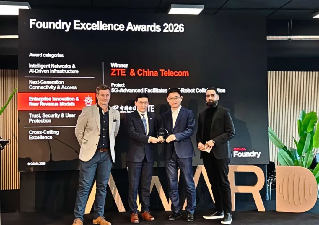 3月1日,GSMA Foundry颁奖仪式圆满落幕。中兴通讯携手中国电信打造的两大创新提案脱颖而出,一举斩获Foundry Excellence Awards 2026两大类别奖项及GSMA Foundry Innovation GLOMO奖共三项大奖。其中,“5G-A 赋能多机器人智能协同”方案摘得"企业创新与新收入模式”奖,“AI智能总检一体机”提案包揽“跨领域卓越”奖与“创新GLOMO”奖,彰显了中兴通讯在5G-A和AI技术融合行业应用领域的全球领先实力,以及在技术创新、商业可行性和产业价值方面的成就。