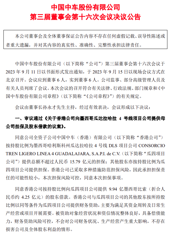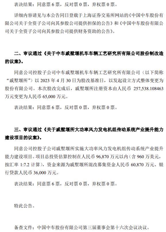 北极星风力发电网网讯,近日,中国中车发布《中国中车股份有限公司第三届董事会第十六次会议决议公告》。