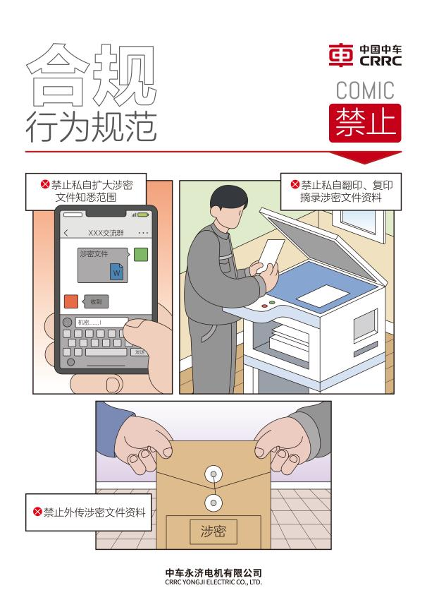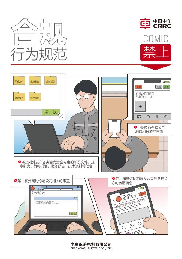 5月28日,中国中车集团《中国中车员工诚信合规手册》,首次提出“中车C(Compliance)”概念,梳理、总结了中国中车集团合规体系,设计了以“123455”为框架的中国中车集团合规管理大厦;同时,手册采用漫画形式编写,以生动形式讲述具体情形下的合规要求,并将员工合规义务创作成朗朗上口的“一口清”。