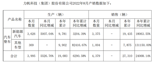 产量方面,力帆科技8月生产汽车3395辆,本年累计生产19683辆,同比增长6290.58%。其中该月生产新能源汽车3626辆,本年累计生产新能源车9781辆,同比增长3204.39%