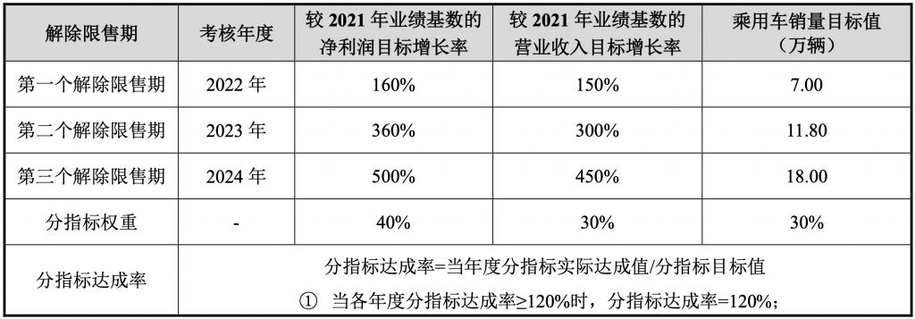 具体而言,2022 年考核目标为以 2021 年业绩为基准净利润目标增长率为 160%,营业收入目标增长率为 150%,乘用车销量目标 7 万辆,2023 年考核目标同样以 2021 年业绩为基准,净利润目标增长率为 360%,营业收入目标增长率为 300%,乘用车销量目标为 11.8 万辆,2024 年考核目标以 2021 年业绩为基准净利润目标增长率为 500%,营业收入目标增长率为 450%,乘用车销量目标为 18 万辆。
