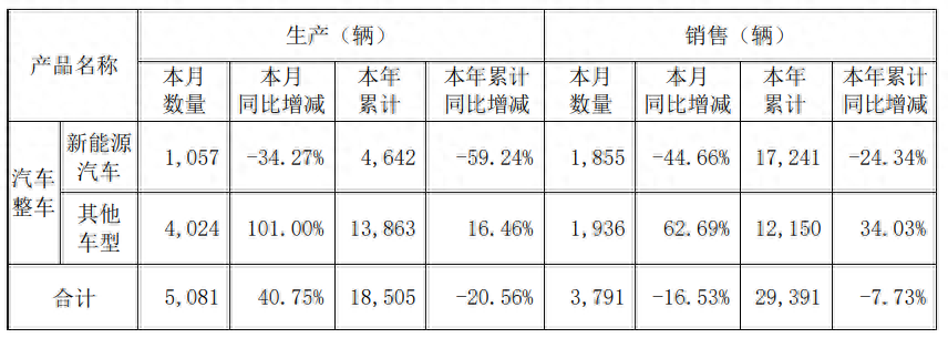 其中新能源汽车 9 月产销分别为 1057 辆、1855 辆,同比减少 34.27%、44.66%;1-9 月累计产销分别为 4642 辆、17241 辆,同比减少 59.24%、24.34%。