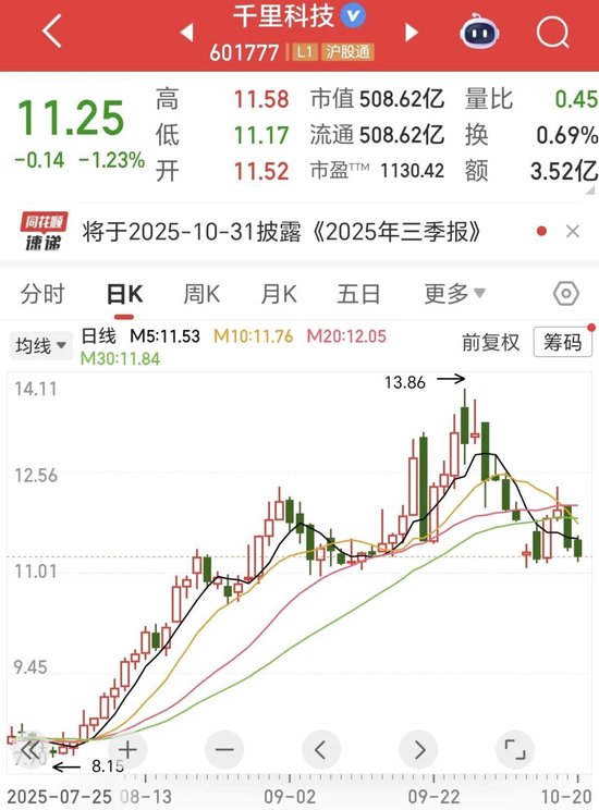 截至10月20日收盘,千里科技报收11.25元/股,市值508.62亿元。