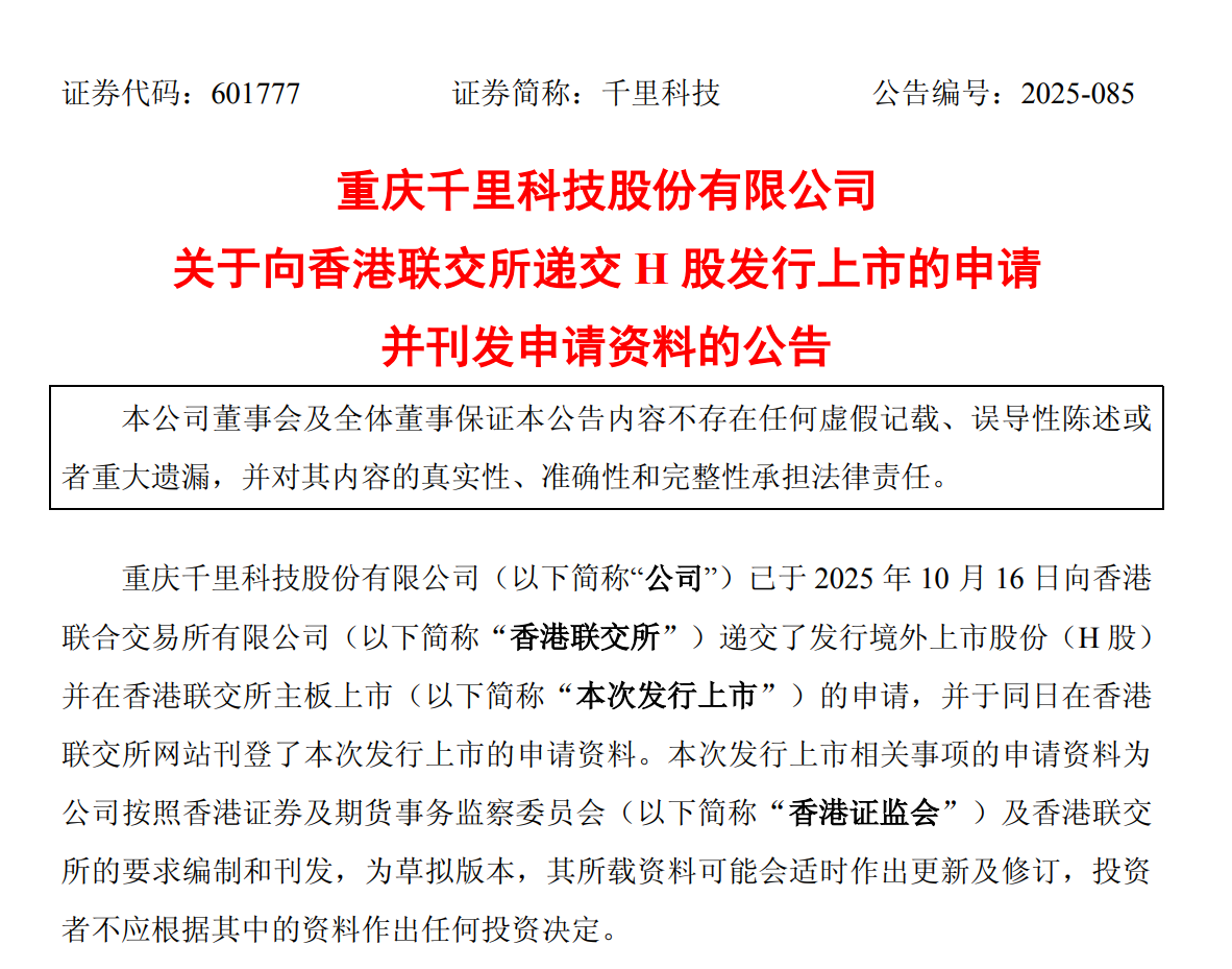 10月16日,据港交所官网,千里科技正式递交主板上市申请书。此前披露的公告显示,公司赴港IPO主要为深化全球化战略布局,加快海外业务发展,提升公司国际化品牌形象,进一步提升公司核心竞争力。