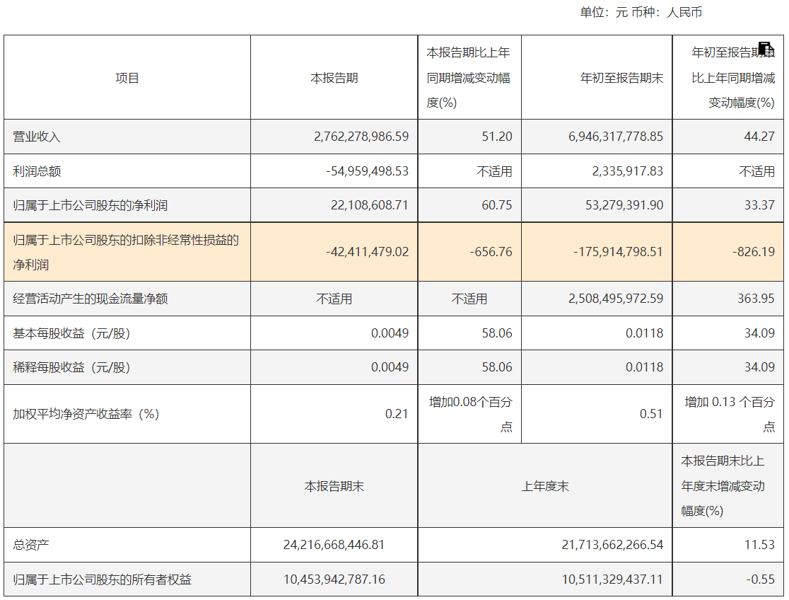 今年前三季度,千里科技实现营业总收入69.46亿元,同比增长44.27%;归母净利润5327.94万元,同比增长33.37%;扣非净利润亏损1.76亿元,上年同期盈利2422.44万元。