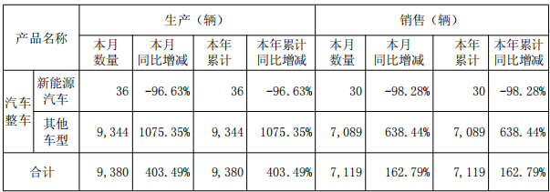 分产品看,“其他车型”(非新能源汽车)表现突出:产量达9,344辆,同比增长1075.35%;销量达7,089辆,同比增长638.44%。而“新能源汽车”产销量同比大幅下降:产量仅为36辆,同比下降96.63%;销量仅为30辆,同比下降98.28%。