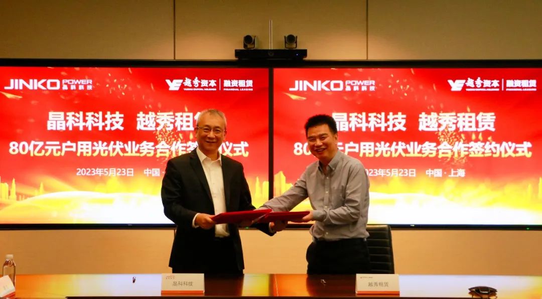 5月23日,晶科科技(601778.SH)与广州越秀融资租赁有限公司(以下简称“越秀租赁”)签署80亿元户用光伏业务合作协议。晶科科技CEO王洪与越秀租赁总经理蒲尚泉代表双方签约,晶科科技新兴业务副总裁李帅、总裁办主任贾建军、户用事业部副总经理解瑞峰、对外合作总监肖斌,浙江越秀租赁总经理卢东光、越秀新能源常务副总宁吉安、越秀融资租赁资金部总经理李威杨、浙江越秀融资租赁光伏业务部总经理袁伟等相关领导出席见签。