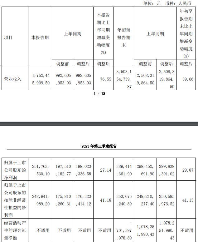 晶科科技近日发布的2023年三季报显示,第三季度营业收入17.52亿元,同比增长76.55%;归属于上市公司股东的净利润2.52亿元,同比增长27.14%。报告期营业收入的增长主要系公司本期户用滚动出售业务量增加及公司持有的电站规模扩大所致。今年前三季度,晶科科技实现营业收入35.03亿元,同比增长39.66%,归母净利润3.89亿元,同比增长29.87%。但是前三季度,公司经营活动产生的现金流量净额为-7.02亿元。