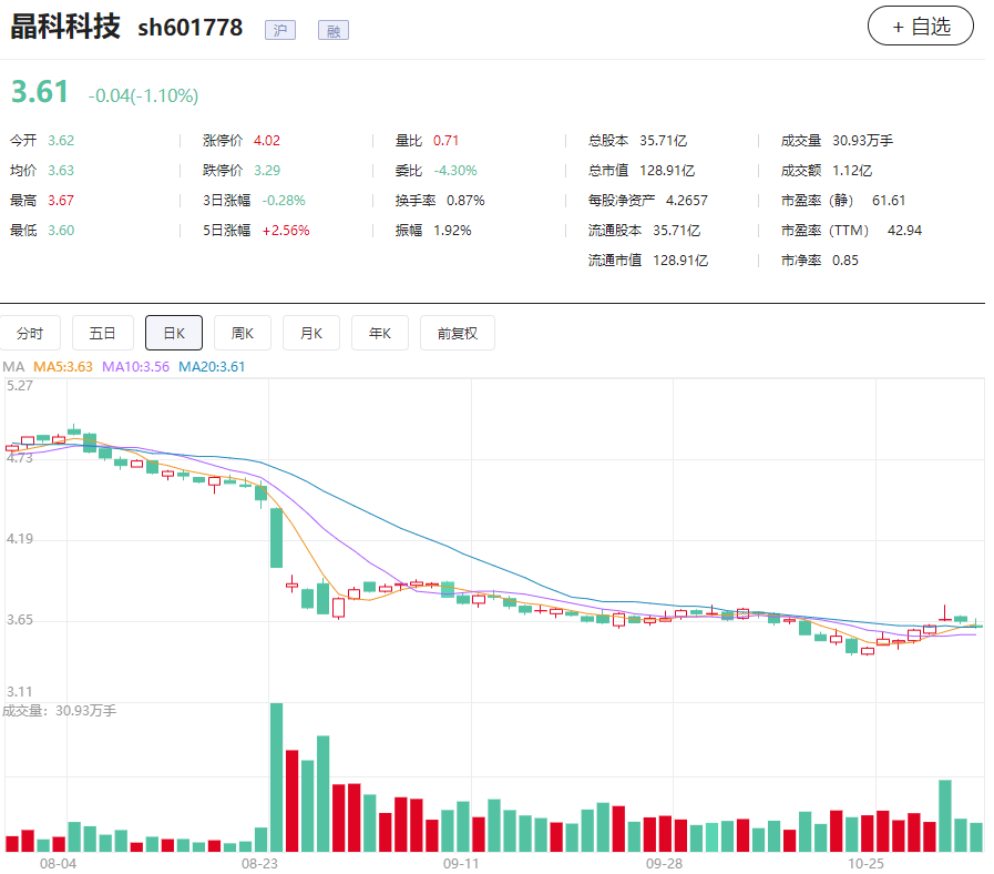 二级市场上,晶科科技今年以来股价震荡下跌,区间跌幅超34%。截至11月2日收盘,晶科科技股价3.61元/股,总市值128.91亿元。