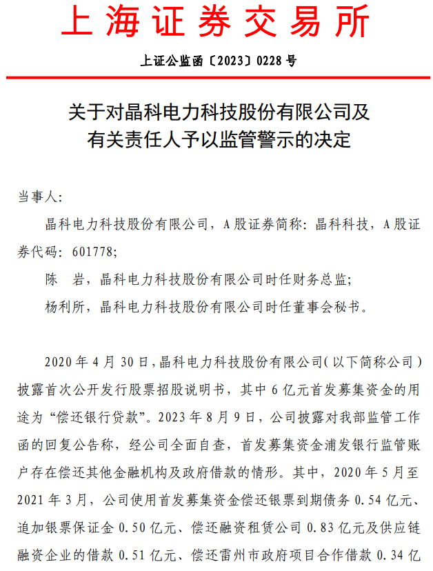 上交所决定对晶科科技及时任财务总监陈岩、时任董秘杨利所予以监管警示。
