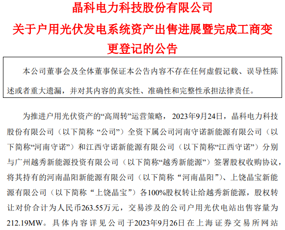 另外,9月25日,晶科科技再次公告,全资下属公司河南守诺、江西守诺于2023年9月24日分别与越秀新能源签署股权收购协议,将其持有的河南晶阳、上饶晶宝各100%股权转让给越秀新能源,股权转让对价合计为263.55万元,本次交易涉及的公司户用光伏电站出售容量为212.19MW。其中,河南守诺转让河南晶阳100%股权的价格为97.99万元,出售容量为116.92MW;江西守诺转让上饶晶宝100%股权的价格为165.56万元,出售容量为95.27MW。