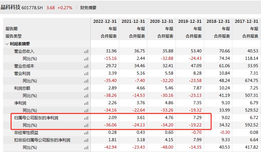 财务数据显示,近年来,晶科科技业绩持续承压,2019年至2020年,归属于上市公司股东的净利润(下称“净利润”)分别下降19.22%、34.20%、24.13%和36.06%。