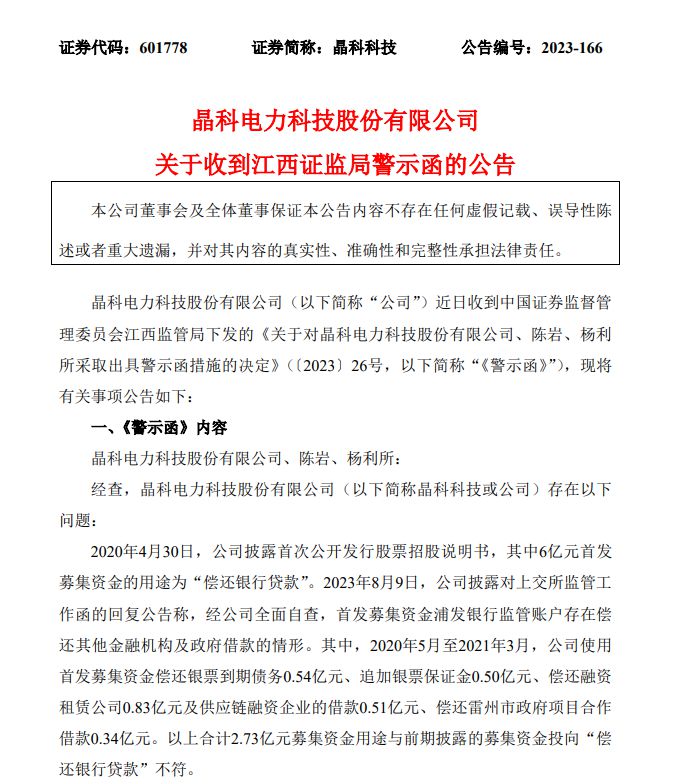 晶科科技10日盘后公告,公司近日收到江西证监局下发的《关于对晶科电力科技股份有限公司、陈岩、杨利所采取出具警示函措施的决定》(以下简称“《警示函》”)。