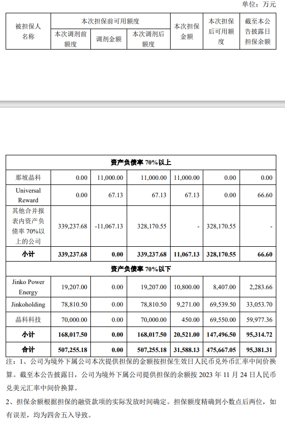 据悉,晶科科技于2023年5月19日召开的股东大会,审议通过了相关议案,同意自该次股东大会审议通过之日起12个月,公司及下属公司为合并报表内下属公司提供人民币166亿元(或等值外币)的新增担保额度(包括原有担保展期或续保)。