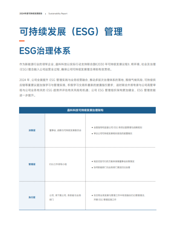在可持续发展管理方面,晶科科技全面驱动ESG管理实践与业务经营的融合,推动多层次治理体系落地,围绕气候风险、可持续供应链等重要议题加强管理实践及外部合作,健全公司ESG管理组织架构,提升管理效能。