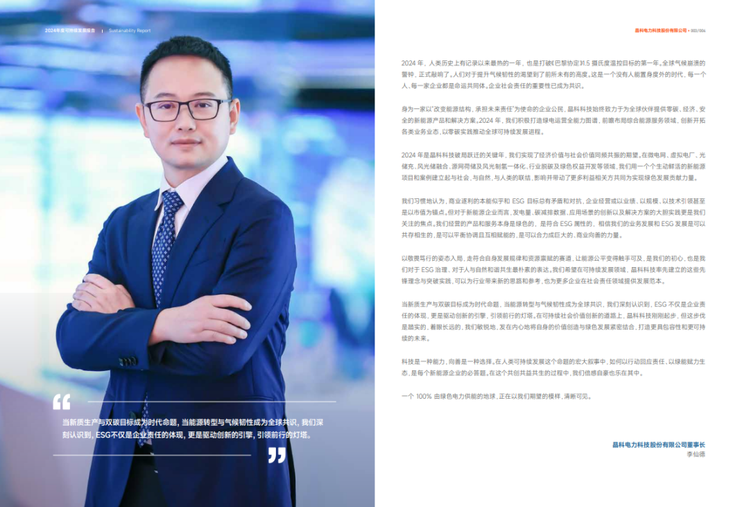 自2024年正式启动ESG体系建设以来,晶科科技聚焦可持续发展管理、公司治理与合规经营、气候行动与绿色共赢、创新与低碳理念、负责任供应链与社区共赢、关爱员工与健康安全等多维度构建核心竞争力。晶科科技董事长李仙德在公司首份可持续发展报告暨《2024年度可持续发展报告》致辞中指出:“当新质生产与双碳目标成为时代命题,当能源转型与气候韧性成为全球共识,我们深刻认识到,ESG不仅是企业责任的体现,更是驱动创新的引擎、引领前行的灯塔。”