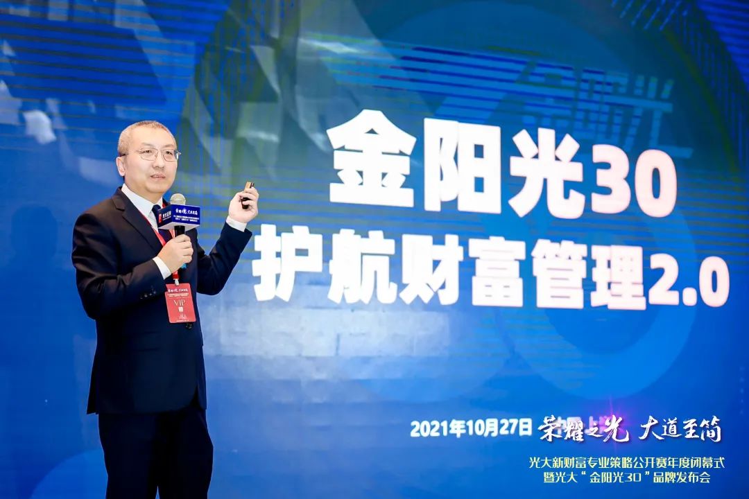 10月27日,由光大证券、光大银行私人银行、光大银行理财子公司、光大期货联合主办的“光大新财富专业策略公开赛年度闭幕式暨光大‘金阳光30’品牌发布会”在上海成功举办。光大证券总裁刘秋明出席并致辞。光大证券业务总监梁纯良作“金阳光30”品牌发布演讲。来自银行、证券、保险、公募及私募机构以及资管公司等300余位嘉宾齐聚一堂,共同展望全球宏观经济和金融环境,深入探讨2022年资产配置和投资方向。